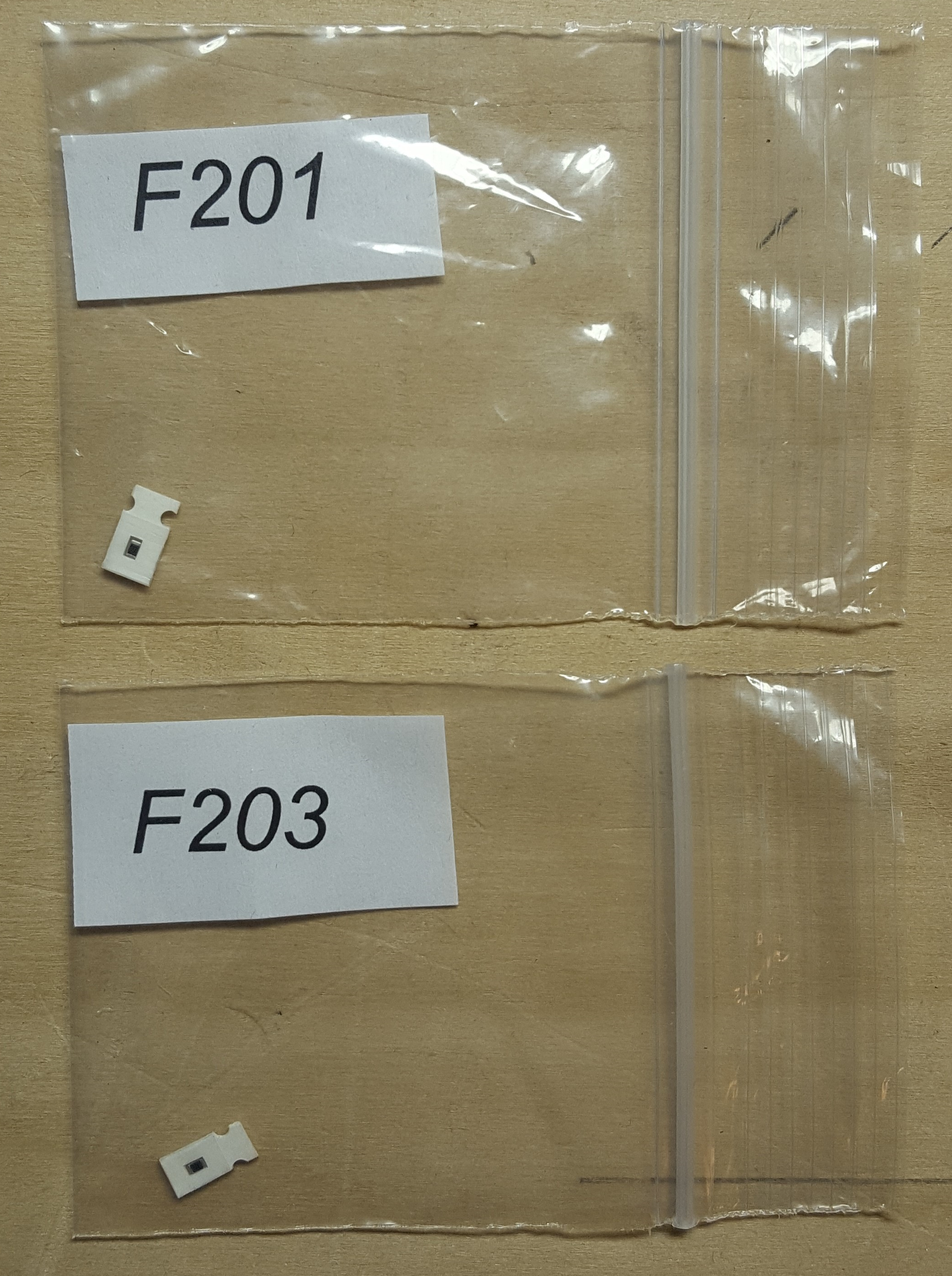 -These are surface mount fuses and are package size 0402. This post is for one of each, one F201 and one F203.